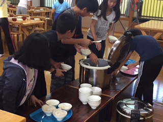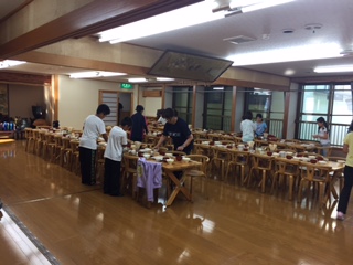 いよいよ朝ごはんです。食事係がみんなのために準備をしています。いっただきま〜す!