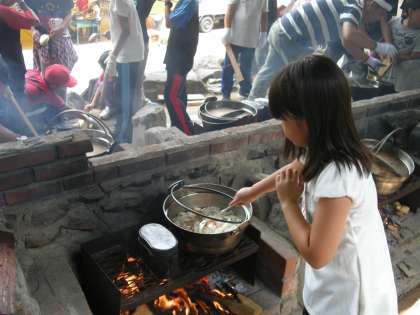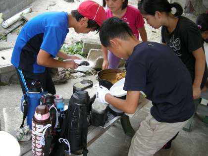 飯盒炊飯が終了しました。かまどを片づけたり、洗い物をしたりしています。一発で合格できるように鍋や飯盒を必死で磨いています。