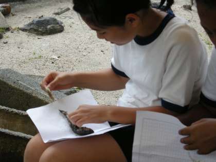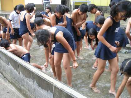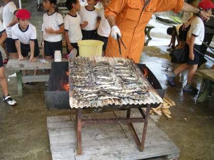 雨が降る中、水着に着替えて魚つかみを行いました。最後まで魚をつかめなかった人のために、つかまえさせてあげようと奮闘する友達の姿も見られました。つかまえた魚(アマゴ)は塩焼きにしていただきました。