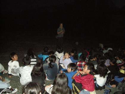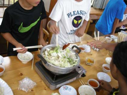 夕食はかもなべでした。子ども達は活動でお腹がすいていたのか、かもなべができあがる前にご飯を食べ始める人が続出しました。聞いてみると、「だって、ごはんがおいしいんだもん。」ということでした。かもなべをたいらげた後は、「星の観察」をしました。雲がかかっていて全然見えなかったのですが、清水先生から星座の話を聞いたり、2択クイズをしたりしていただいている間に、星が見え始めました。また「無の時間」の最中にはホタルが光っているのを見た人もいます。最後には松田先生こだわりの打ち上げ花火を楽しむことができました。活動が終わり、真っ暗な夜道を活動班ごとに1本のライトをたよりに宿舎まで帰りました。