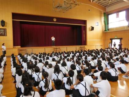 8月25日(金)始業式で子ども達の元気な顔を見ることができてホッとしました。教室では宿題や自由研究を集めたり、夏の思い出を発表したりしていました。