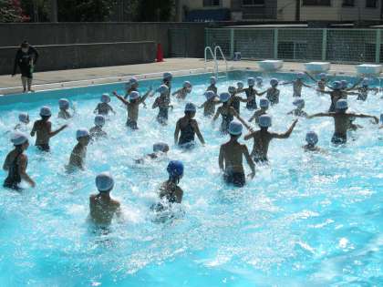 8月31日(木)2時間目、2年生の今年最後のプール水泳でした。子ども達はキラキラした笑顔で最後の水を楽しんでいました。後半の水泳大会では、25mを(1)走る (2)ビート板を持ってバタ足で進む (3)バタ足だけで泳ぐ と自分にあった目標を立てて挑戦していました。どの子も100%以上の力を出し切ったようで満足した顔をしていました。最後に浮島を使ってリレーをしました。