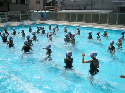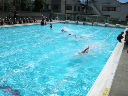 8月31日(木)3時間目 3年、今年最後のプール水泳です。いつも通りの練習の後、クロールで25mに挑戦しました。なんと27人が25mを達成させました。20m近くまで泳げている人も何人もいますので、来年が楽しみです。最後は浮島等を使ってのワクワクタイムがありました。