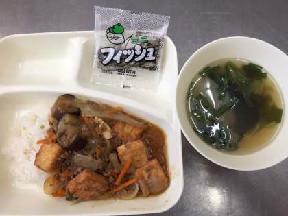マーボー厚揚げ丼、中華スープ、ミニフィッシュ、牛乳でした。