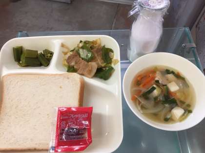 9月7日(木)ホイコウロー、とうふのスープ、オクラの中華あえ、パン、牛乳