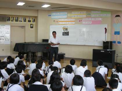 9月9日(土)2時間目、5年生は平尾にお住いの金城さんからお話を聞きました。金城という苗字は「カナグスク」とよんでいたのに、小学校へ入学にあたって、父親から「かねしろ」と変える話が合ったというご自身の体験をもとにわかりやすくお話をしていただきました。最後にエイサーのお話も聞きました。5年生の子ども達は運動会でエイサーを踊るため、練習に励んでいますが、エイサーの踊りの意味を知ったことで、踊りが変わると思います。月曜日からの練習が楽しみです。