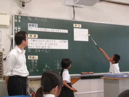 9月12日(火)2時間目、4年2組で算数の研究授業が行われました。わり算のひっ算の仕方を考える授業で、子ども達は「見通し」をもとにペアで計算の仕方を考えていきました。発表ボードを使っての発表も上手にできていました。