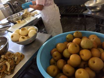 給食調理員さんに聞きますと、今日は大量の梨の芯とりと皮むきが大変だったそうです。