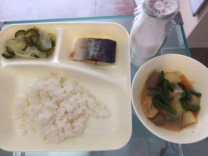 さごしの塩焼き、じゃがいもと一口がんもの煮もの、キャベツときゅうりのゆずの香あえ、米飯、牛乳。