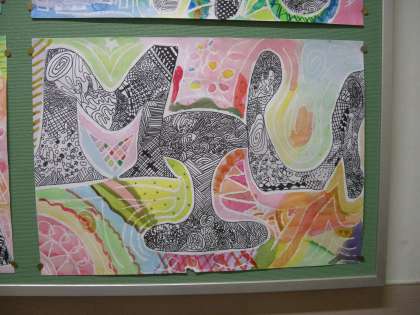 9月29日(金)2号階段の2階から3階へ向かう踊り場の掲示板に素晴らしい作品を見つけました。たぶん5年の作品ではないかと思います。よく見るとローマ字で名前が書かれているようにも見えます。実物を見ると感動的です。学校へ絵を見に来ませんか?