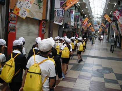 10月5日(木)3年生が天神橋筋商店街とキッズプラザ大阪へ遠足に行きました。3年生も電車に乗ったり、道を歩くマナーがとてもよかったです。日本一長い商店街で、私は2組の後を歩いていて2組の子ども達にクイズを出しました。「普通、商店街にあるはずの店がこの商店街にないものがあると思いますが、何でしょう?」です。私は観光客の多い商店街なので生活に必要な八百屋がないと思っていました。ところが子ども達は八百屋を2軒発見した上に、魚屋と肉屋と電機屋がないことを見つけました。今度見学に行く泉尾商店街はどうでしょうね。楽しみになってきました。
