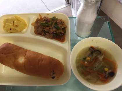 10月6日(金)豚肉と野菜のケチャップソテー、スープ、スイートポテト、パン、牛乳