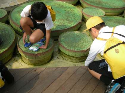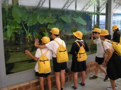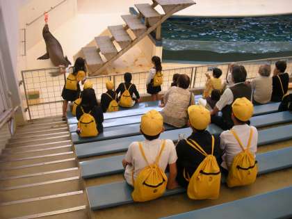 鳥羽水族館で魚だけでなく、いろいろな生き物を見ました。写真はアシカのショーとドクターフィッシュに手を噛んでもらっている様子、そしてスナドリネコを見ている子ども達です。