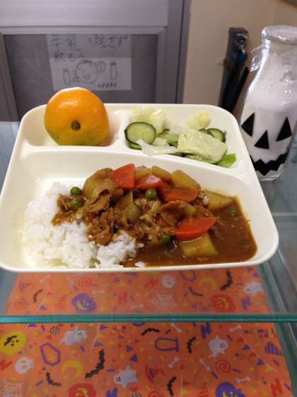 10月17日(火)ポークカレーライス(米粉)、グリーンサラダ、みかん、牛乳