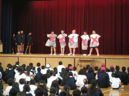 10月18日(水)児童集会で運動委員会がボールの使い方等について、寸劇でお知らせしました。だめなことをしたら、「×」の服を着た人に注意されます。低学年の人にもわかりやすい内容でした。
