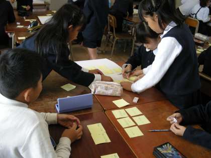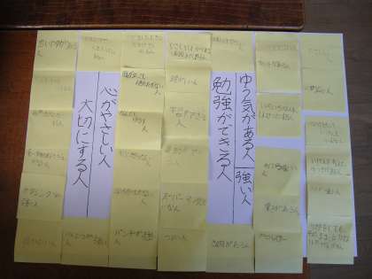 10月18日(水)1時間目、4年1組で道徳の学習をしました。子ども達の自主学習で持ってきていた新聞記事に「強い人」について書かれていました。そこから学習が始まりました。今日は班で「ほんとうに強い人はどんな人?」をふせんとKJ法を使いながら話し合っていきました。普段話し合いに積極的でない人も一生懸命話し合っている姿がありました。右の写真はある班が意見をまとめたものです。