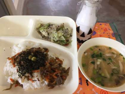 10月20日(金)牛肉のきんぴらちらし、みそ汁、キャベツの赤じそあえ、ごはん、牛乳
