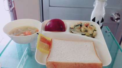 スープ煮、ほうれん草のグラタン、りんご、食パン、りんご