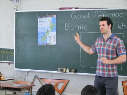 「バーニーと呼んでね」と陽気に話す先生の出身地はニュージーランド。子どもたちは最初の出会いのためか、やや緊張気味でした。