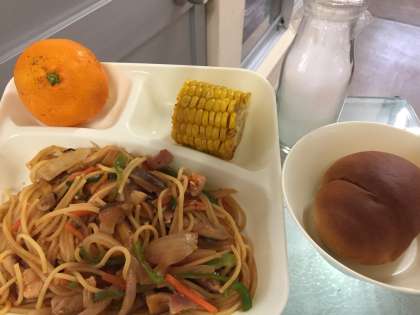 11月8日(水)きのこのスパゲッティ、焼きとうもろこし、みかん、パン、牛乳