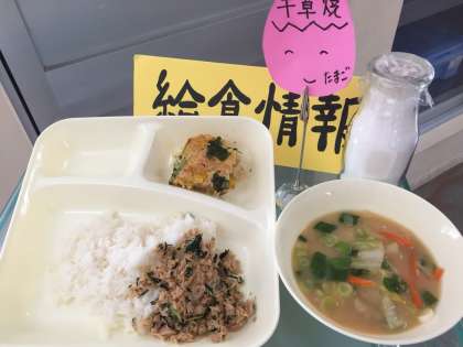 千草焼き、みそ汁、ツナっ葉いため、米飯、牛乳。