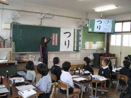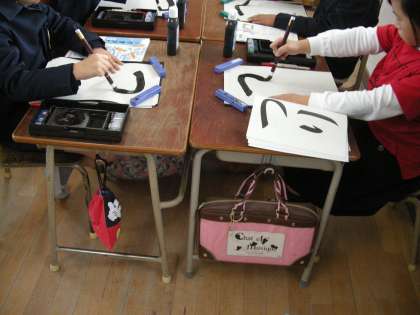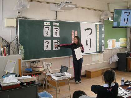 11月16日(木)5時間目、3年1組で書写の公開授業が行われました。小中連携で行われた授業で、北恩加島小学校から2人の先生が見に来られました。今日はひらがなの「曲がり」を意識して書きました。最後にためし書きとまとめ書きを比べると、明らかによくなっていました。