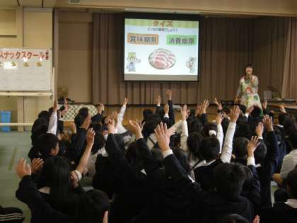 11月16日(木)5〜6時間目に5年生がカルビーの方からおやつの食べ方を教えていただきました。前半はおやつの適量を学びました。普段自分たちが多く食べていることに驚いている子ども達が多かったように思います。後半は、賞味期限と消費期限の話に続いて1週間のおやつを考えました。一日平均のカロリーを計算して、おやつの摂り方としてよいかどうか話し合いました。