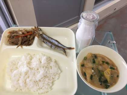 焼きししゃも、みそ汁、きんぴらごぼう、米飯、牛乳。