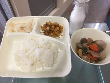 鶏肉と野菜の煮もの、じゃこ豆、かぶのゆず風味、米飯、牛乳。