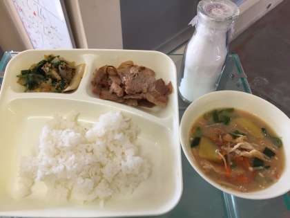 12月6日(水)豚肉のしょうが焼き、さつまいものみそ汁、きくなとはくさいのごまあえ、ごはん、牛乳