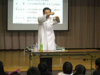 1月11日(木)5時間目、6年生は多目的室で学校薬剤師のヤマサキ先生から「薬の正しい使い方」と「薬物乱用」についてのお話を聞きました。薬をお茶や牛乳で飲むとどうなるのかの実験も見せていただきました。もちろん、水やぬるま湯で飲むのが正解ですね。