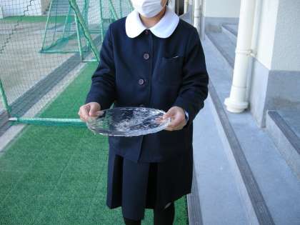 運動場に置いたバケツには厚さが1センチメートルぐらいの氷が張っていました。寒い冬も楽しむことができますね。家でも挑戦してみてはいかがでしょうか!