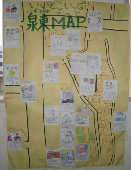 1月17日(水)2年2組の教室の前で「いいとこいっぱい泉東MAP」を見つけました。2年生が町たんけん等で見つけてきたものだと思われます。お店等の「場所」ばかりではありません。「見守り隊」の絵に「いつも角に立ってくれていて、あいさつをすると、かえしてくれるところがすごいです。」や「地域の人」の絵に「場所がわからないときにやさしく教えてくれました。」と書いてありました。地域の「人」にも目を向けられる子ども達は素敵だなと思いました。MAPが子ども達の気付きでいっぱいになればいいなと思いました。