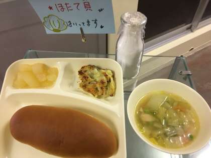 ほたて貝のグラタン、スープ、和なし(カット缶)、黒糖パン、牛乳。 グラタンが人気でした。