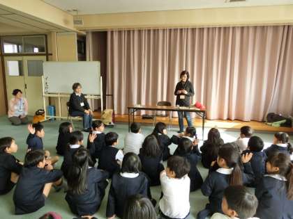 今日のお話会は3年生がクラスごとに多目的室に移動して行われました。大正図書館から館長さんも来られていました。外は寒かったのですが、心温まるお話に子どもたちは聞き入っていました。