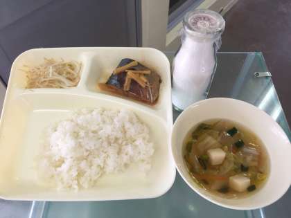 さばのみそ煮、すまし汁、もやしのゆずの香あえ、米飯、牛乳。