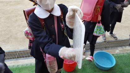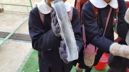 新たな寒波到来ということで職員室の前では厚く張った氷を手に歓声をあげる子どもたちの姿が多く見られます。まるで「氷まつり」のようです。寒さを楽しみましょう。明日もどれだけの氷ができるか楽しみです。