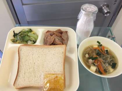 豚肉のオイスターソース焼き、糸寒天のスープ、ピリ辛あえ、食パン、マーマレード、牛乳。