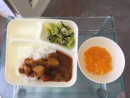 ハヤシライス、キャベツのひじきドレッシング、みかん(缶)。