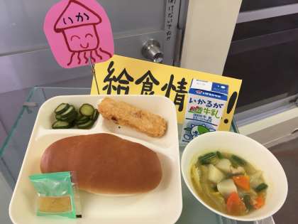 2月14日(水)いかてんぷら、スープ煮、きゅうりのピクルス、パン、牛乳