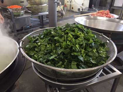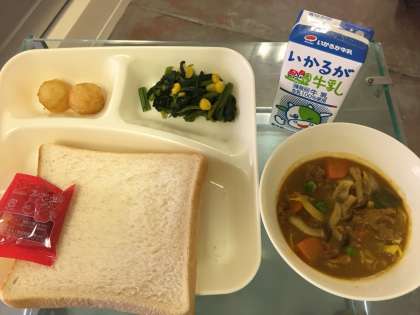 豚肉と野菜のカレー煮、ほうれん草のソテー、あげポテトもち、食パン、イチゴジャム、牛乳。