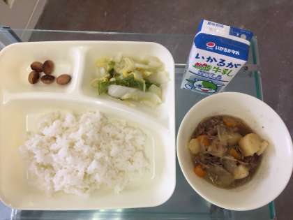 肉じゃが、はくさいの甘酢づけ、とら豆の煮もの、米飯、牛乳。肉も野菜も豆も柔らかくて、どれもとってもおいしかったです。