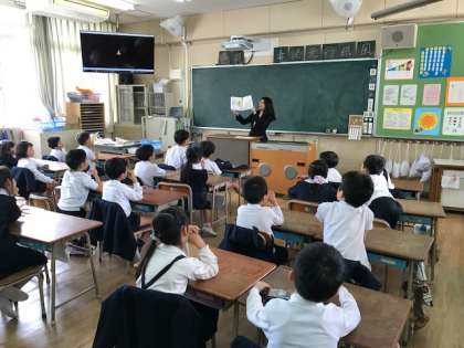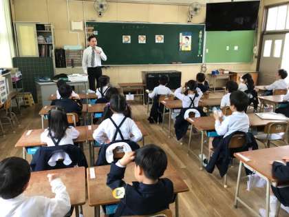 4月18日(水)今年も水曜日の昼休みの後、全校でイングリッシュタイムをします。恒例の教頭先生の「ハロー エブリワン!」で始まり、今日はウイリアム先生の自己紹介がありました。その後、各教室でDVDや絵本を使っての学習が始まりました。