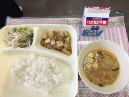 焼きとり、みそ汁、きゅうりともやしのゆずの香あえ、米飯、牛乳。