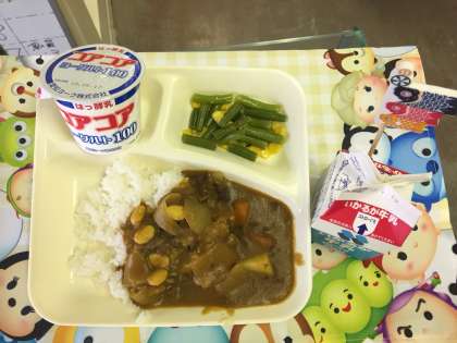 牛肉と大豆のカレーライス、三度豆とコーンのサラダ、ヨーグルト、米飯、牛乳。
