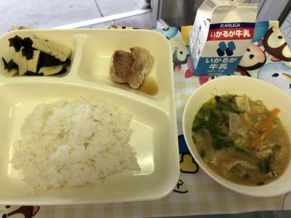 赤魚のしょうゆだれかけ、みそ汁、わかたけ煮、米飯、牛乳。