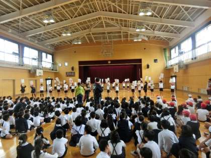 今年度1回目の児童集会の様子です。6年生のリーダーを先頭に1年生から各学年の子が混じった班を今日は作りました。班名は「あ」〜「し」までの頭文字から構成されています。ぜひお子さんの班名を聞いてみてください。