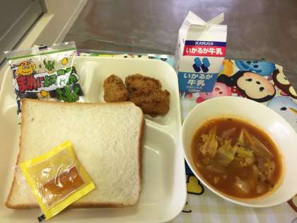 一口トンカツ、ミネストローネ、豆によろこぶ、食パン、あんずジャム、牛乳。