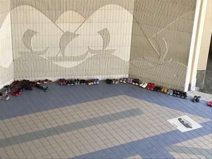 5月11日(金)1時間目、体育館からどこかの学年が運動会の練習をしている声が聞こえてきます。よくみるとくつがきれいに並んでいました。(一人だけ違う方向を向いているくつがありましたが・・・)思わず写真をとりました。