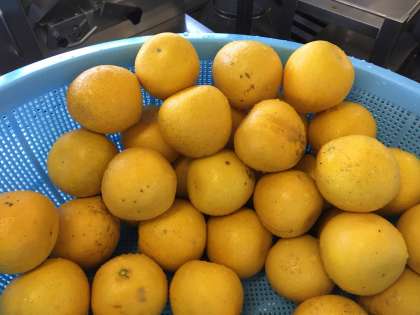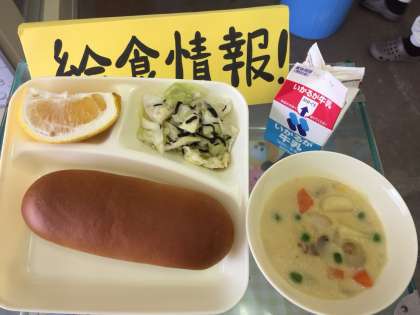 コーンクリームシチュー、キャベツのひじきドレッシング、河内ばんかん、黒糖コッペパン、牛乳。